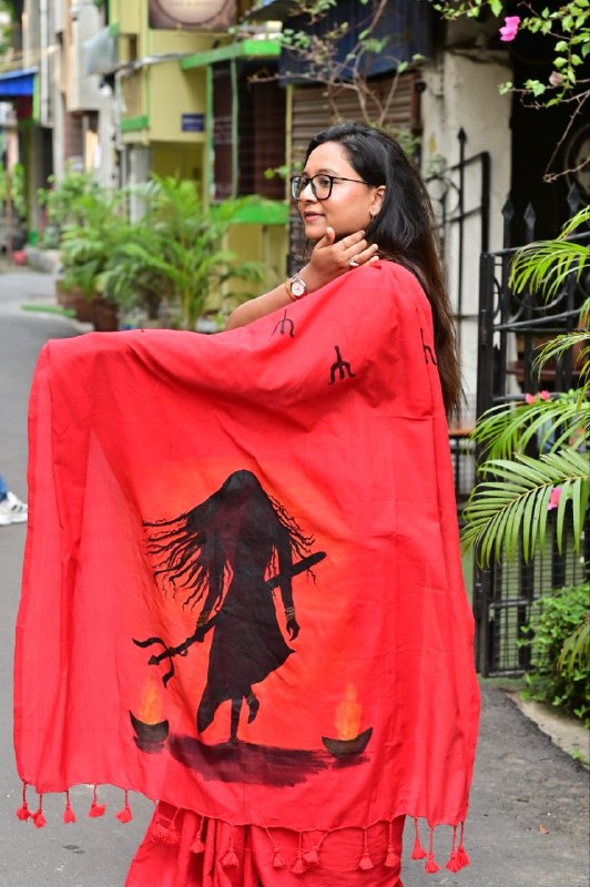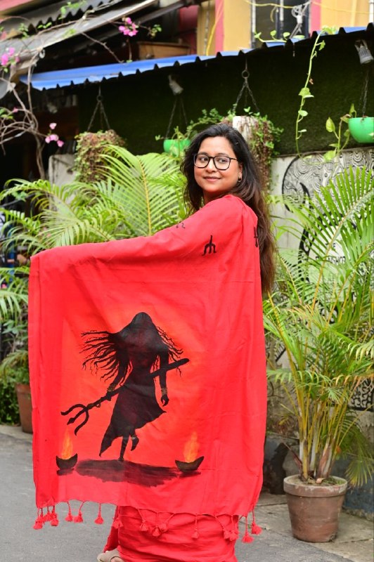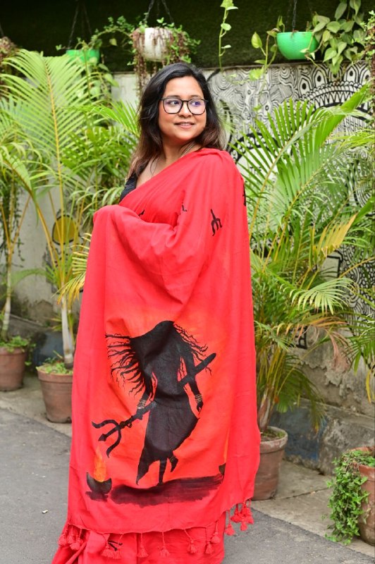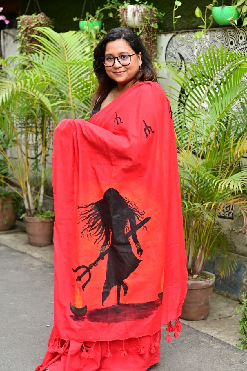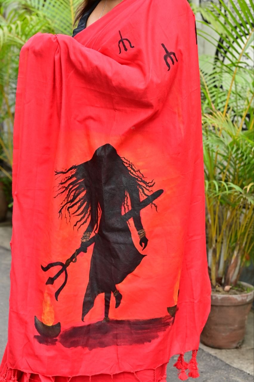 Draped in a striking red base symbolizing power and passion, this saree features a dramatic hand-painted silhouette inspired by Goddess energy, holding the trishul — a symbol of शक्ति, balance, and transformation. The artwork captures movement, intensity, and spiritual depth, while the subtle motifs across the saree add a touch of traditional harmony.