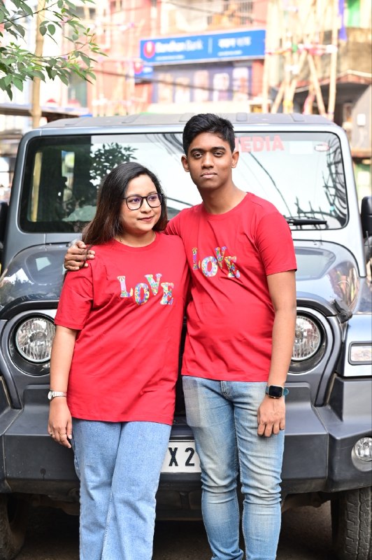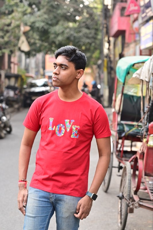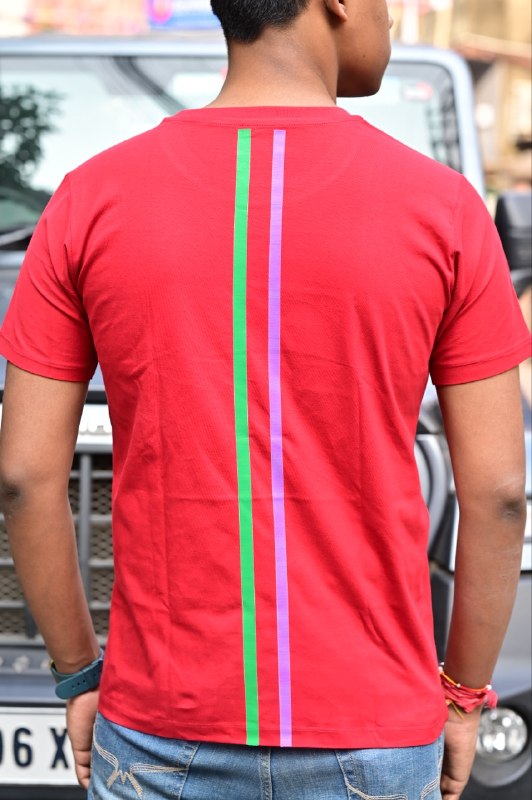 Set on a striking red base, this tee features a vibrant multicolor “LOVE” print that instantly catches the eye. The playful typography adds an artistic, youthful vibe, while the back is elevated with minimal vertical color stripes, giving it a subtle designer edge.