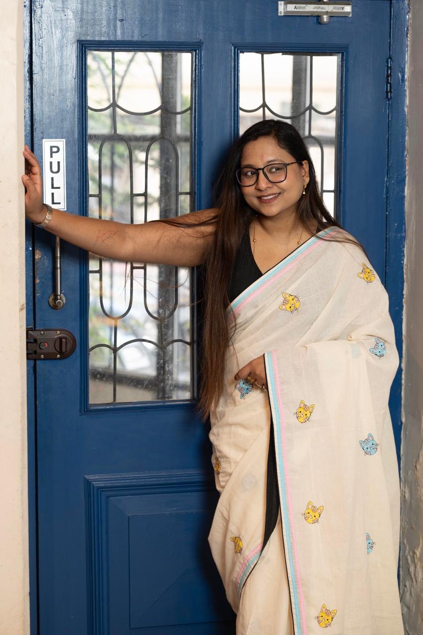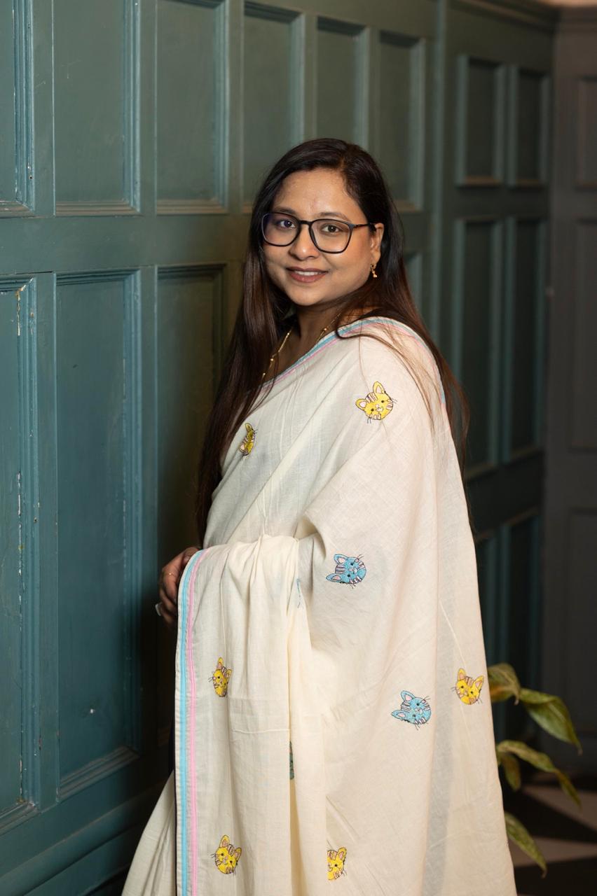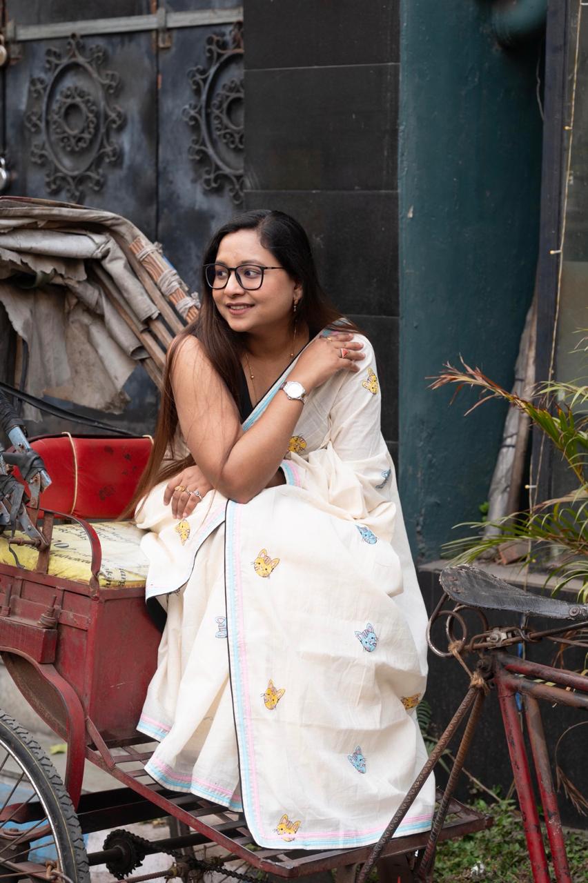 Set on a soft ivory cotton base, this saree is adorned with delicately embroidered cat motifs scattered across the drape — each one adding personality, warmth, and a handcrafted story. The gentle pastel border, kissed with hues of blue and pink, frames the saree with understated grace, balancing whimsy with sophistication.