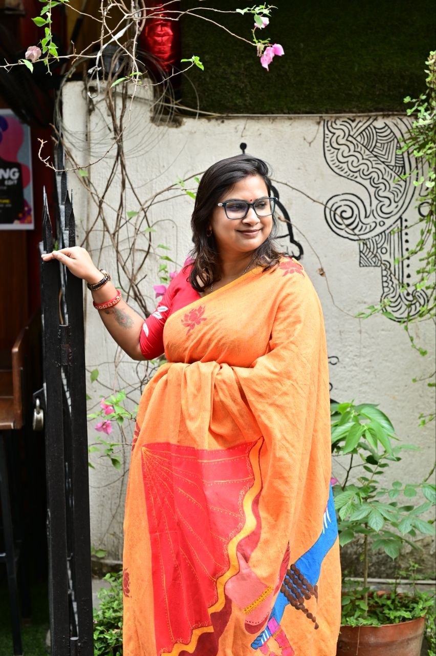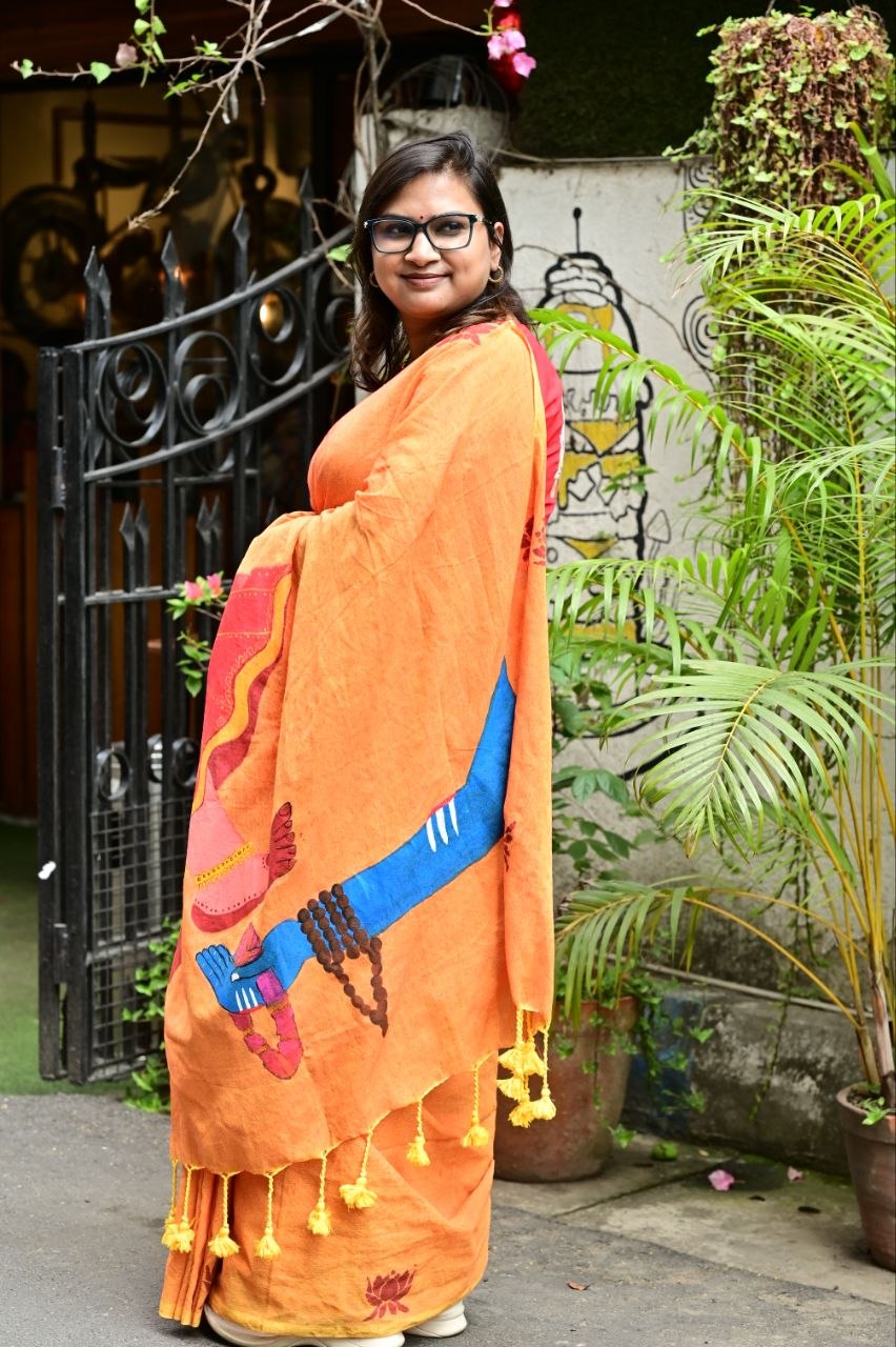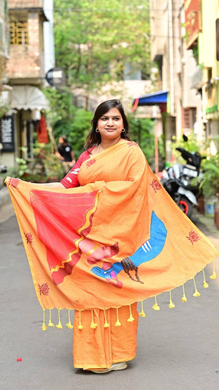 Crafted in breathable khadi cotton, this saree features a striking hand-painted depiction inspired by Lord Shiva and Goddess Parvati on the pallu — symbolizing the union of strength and grace, stillness and energy. The warm earthy tones of orange and red reflect devotion and vitality, while delicate motifs across the body add a subtle traditional charm.