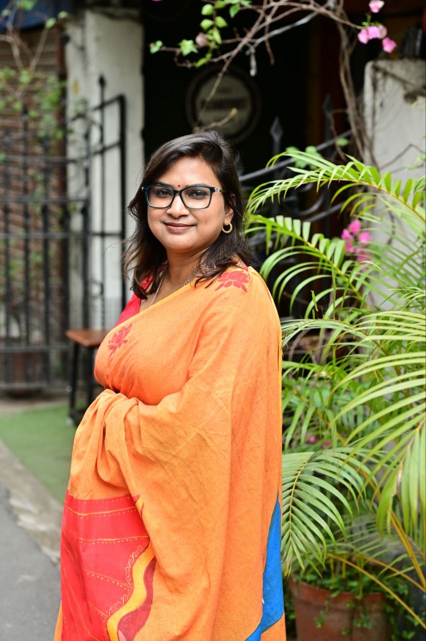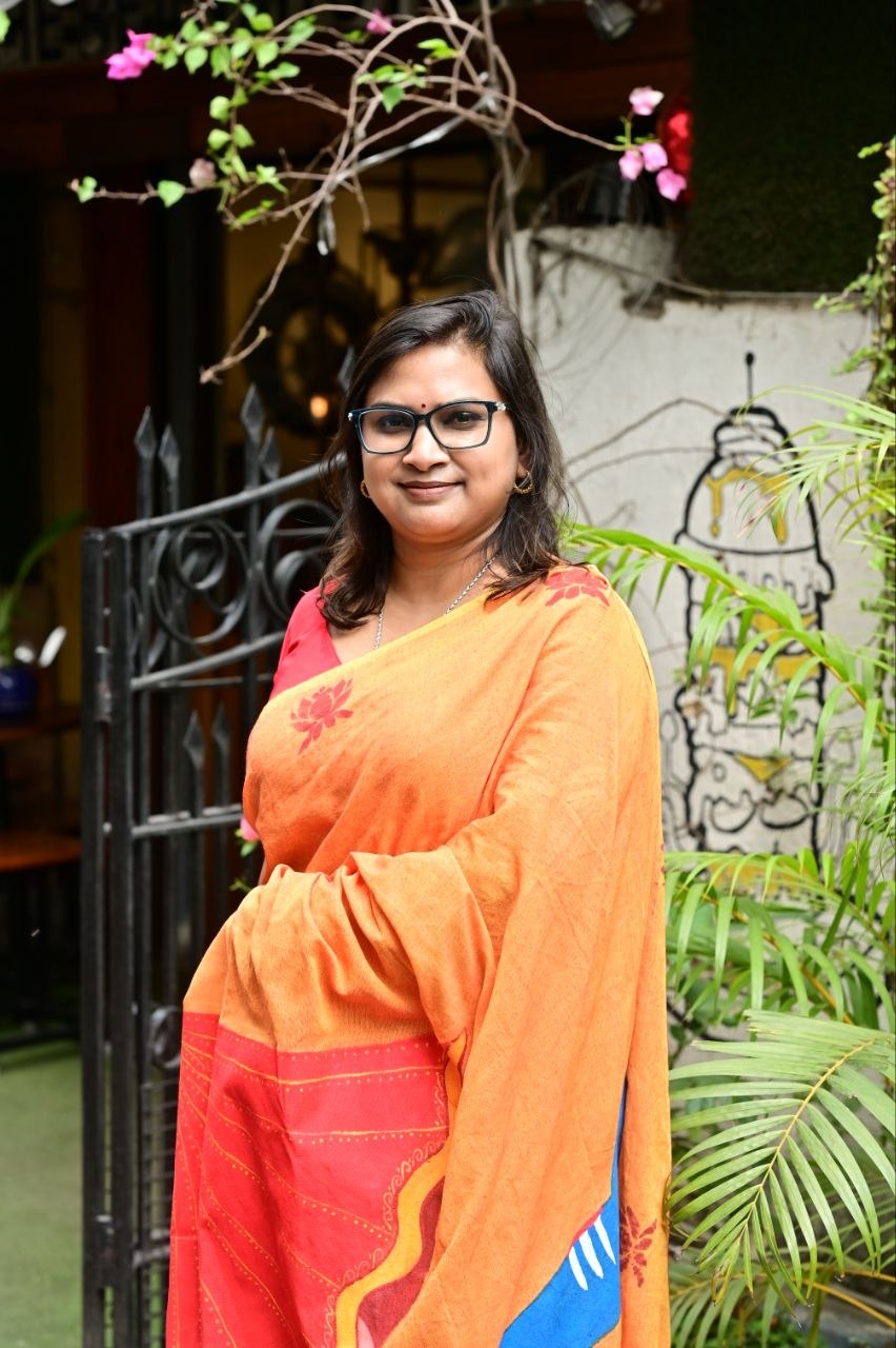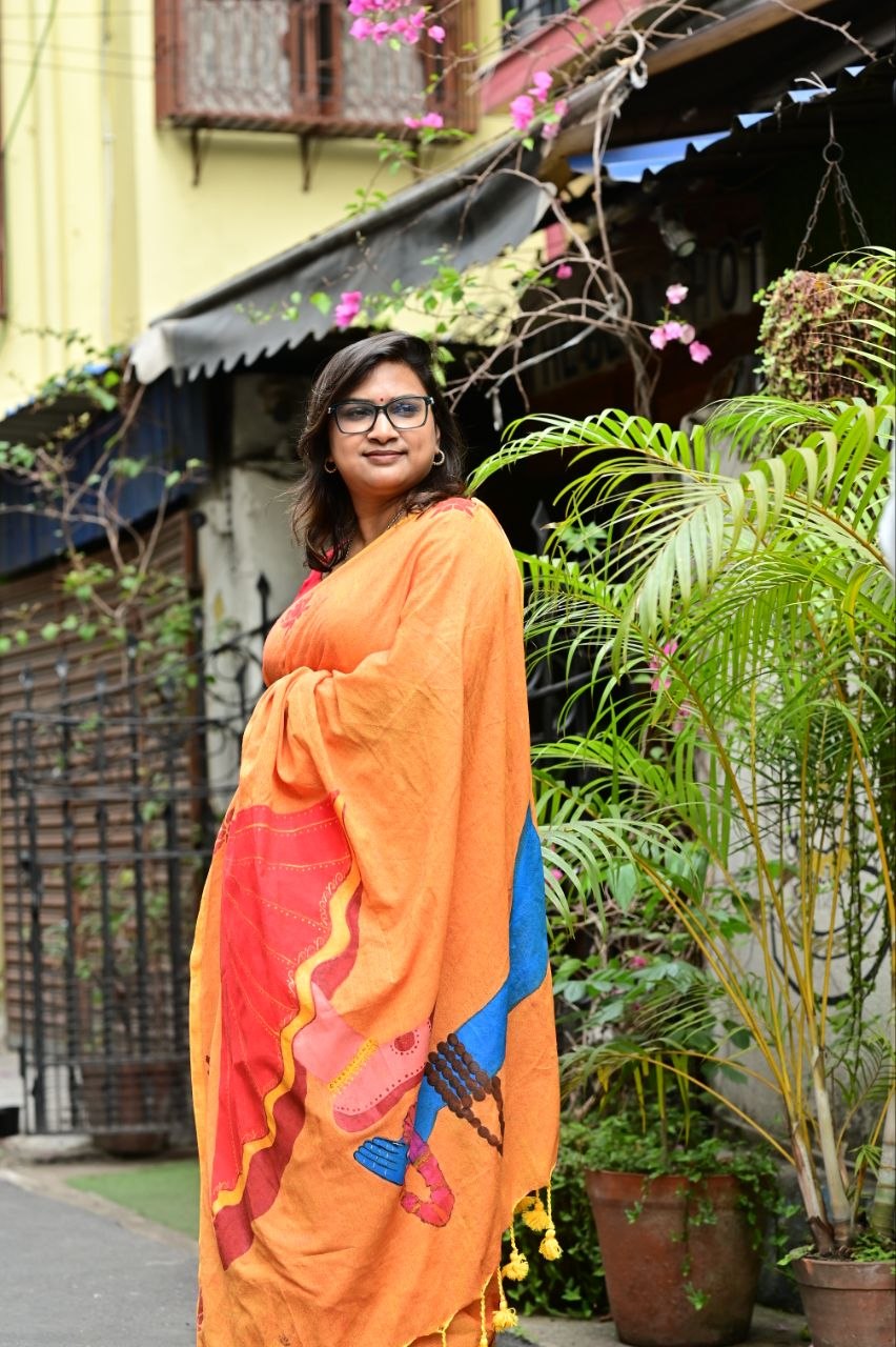 Crafted in breathable khadi cotton, this saree features a striking hand-painted depiction inspired by Lord Shiva and Goddess Parvati on the pallu — symbolizing the union of strength and grace, stillness and energy. The warm earthy tones of orange and red reflect devotion and vitality, while delicate motifs across the body add a subtle traditional charm.