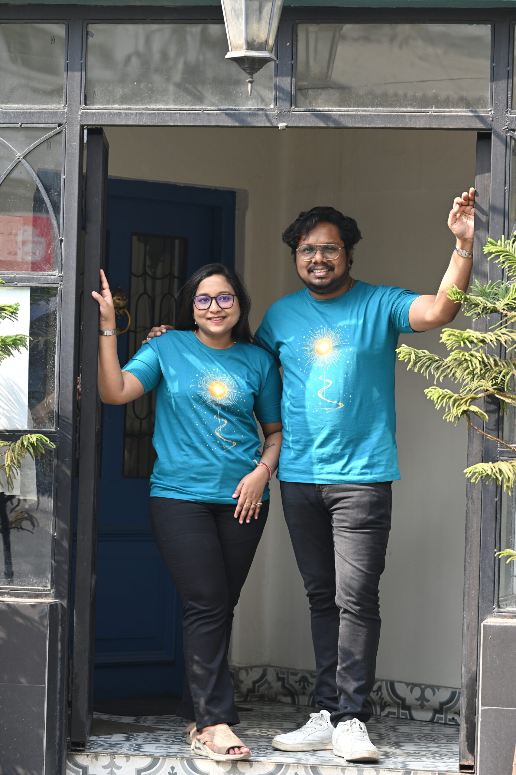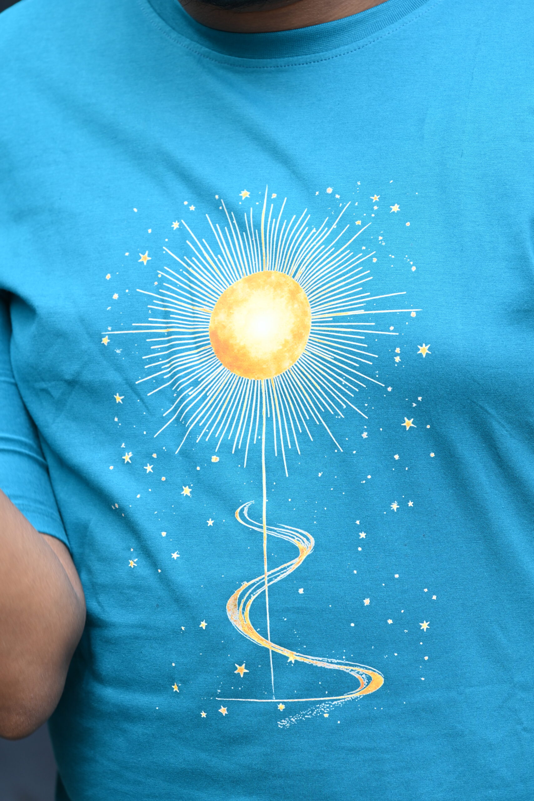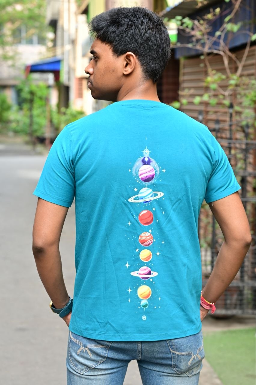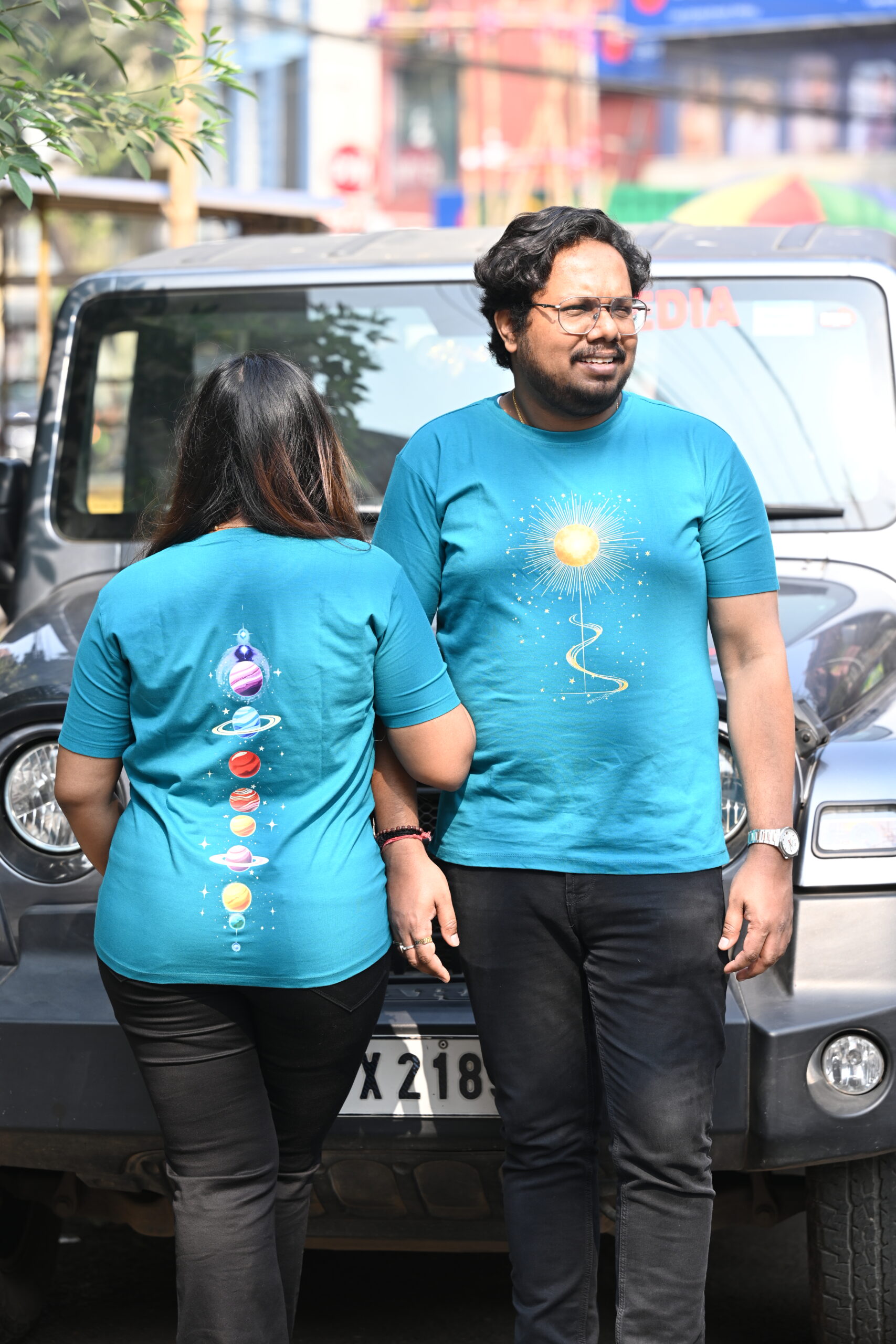 Crafted in rich teal tones, this coordinated set beautifully blends minimal front elegance with a vibrant celestial narrative on the back. The front features a radiant sun motif with delicate starburst detailing, symbolizing energy, warmth, and connection. Turn around, and the magic unfolds — a vertical alignment of dreamy planets, each hand-illustrated to evoke wonder, balance, and the infinite beauty of the cosmos.